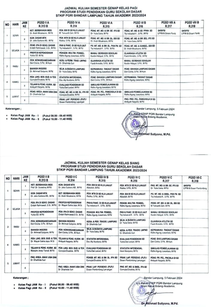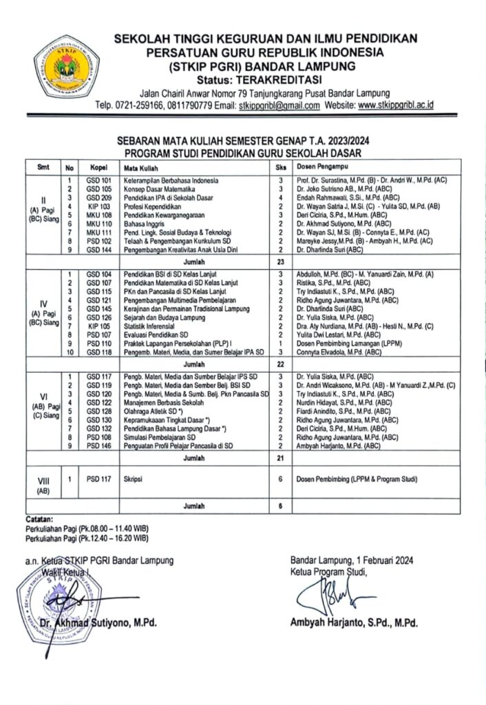 Pengumuman Sebaran Mata Kuliah dan Jadwal Perkuliahan Semester Genap Tahun Akademik 2023/2024 February 1, 2024 pgsd