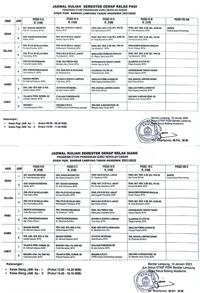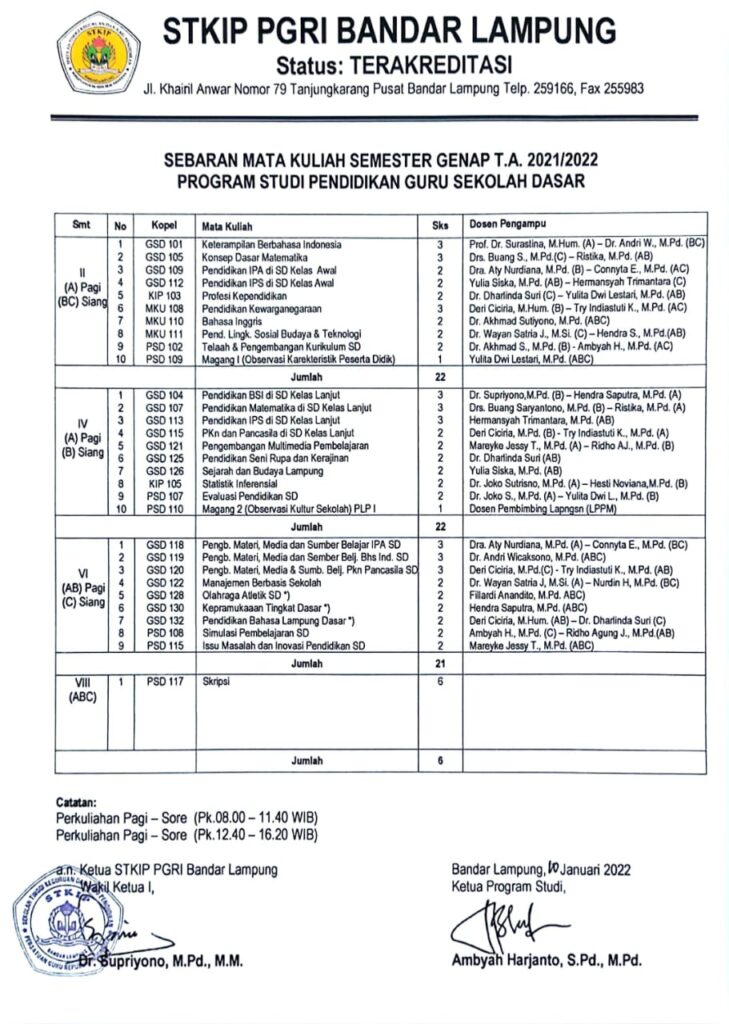 Pengumuman Sebaran Mata Kuliah dan Jadwal Perkuliahan Semester Genap Tahun Akademik 2021/2022 January 10, 2022 pgsd
