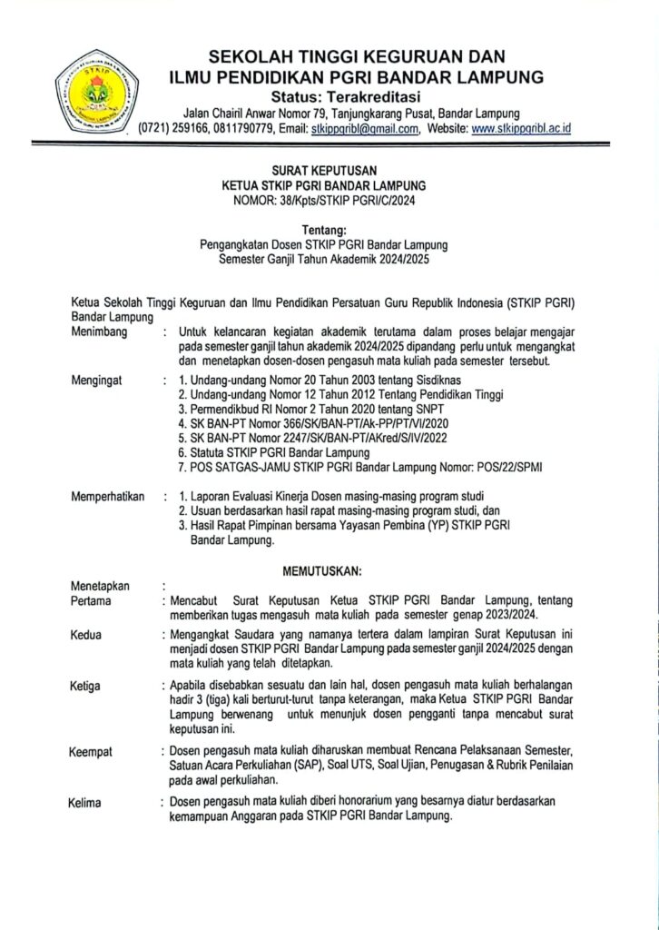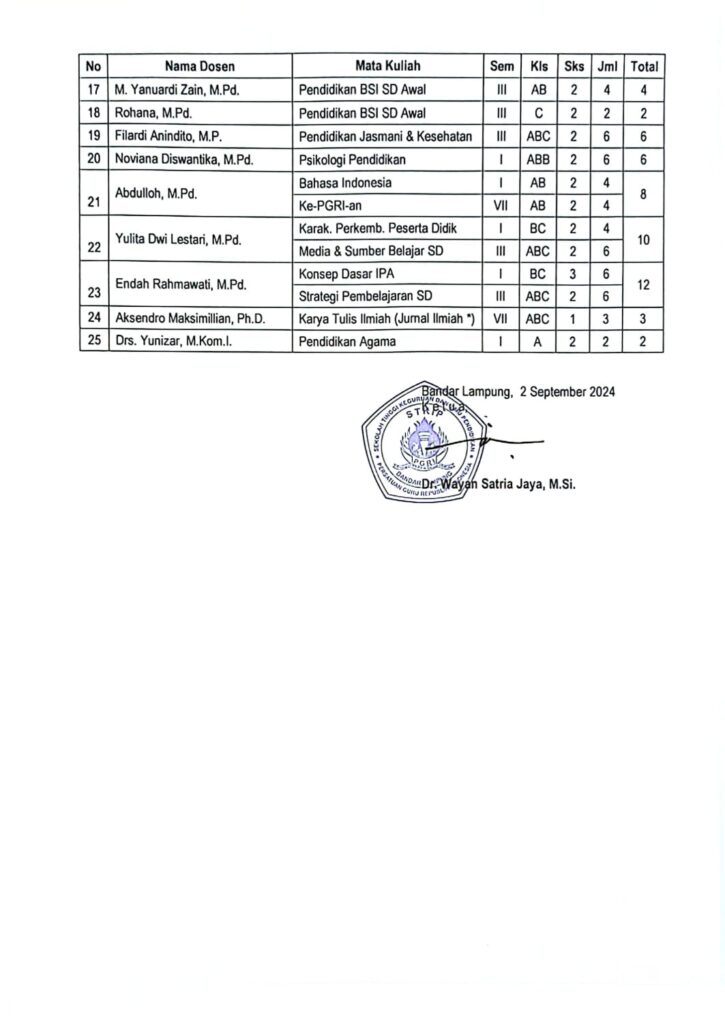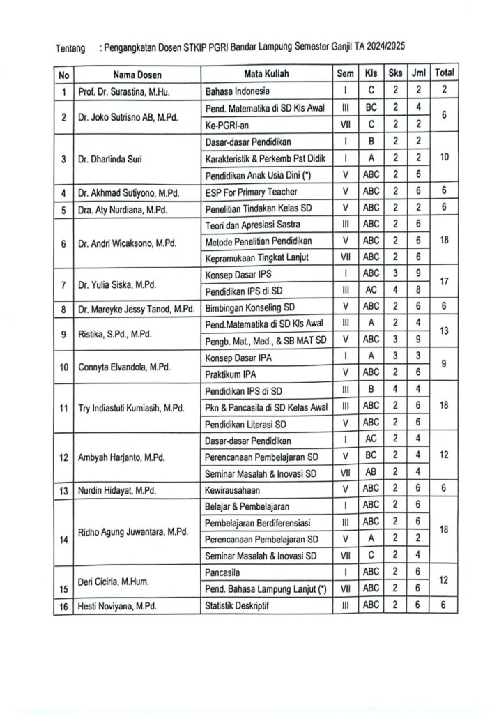 Pengumuman Tugas Mengajar Semester Ganjil T.A. 2024/2025 Dosen Program Studi S1 PGSD STKIP PGRI Bandar Lampung September 2, 2019 pgsd
