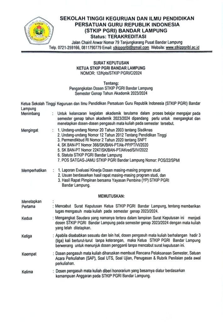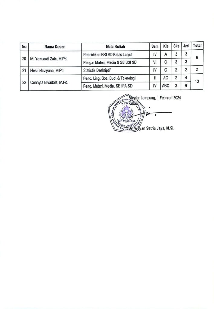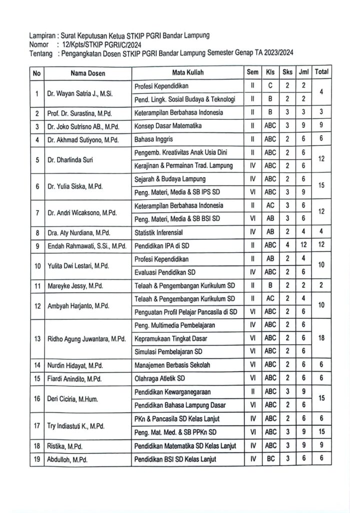 Pengumuman Tugas Mengajar Semester Genap T.A. 2023/2024 Dosen Program Studi S1 PGSD STKIP PGRI Bandar Lampung February 1, 2024 pgsd